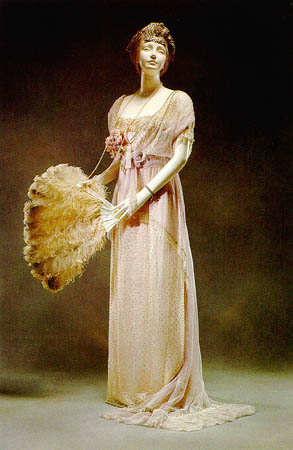 While their skirts hadn’t risen yet and the corset was still de rigueur, women were enjoying looser-fitting dresses,even in formal wear. You can see the “flapper” look starting to creep in, especially around the waist. 1914 formal wear: