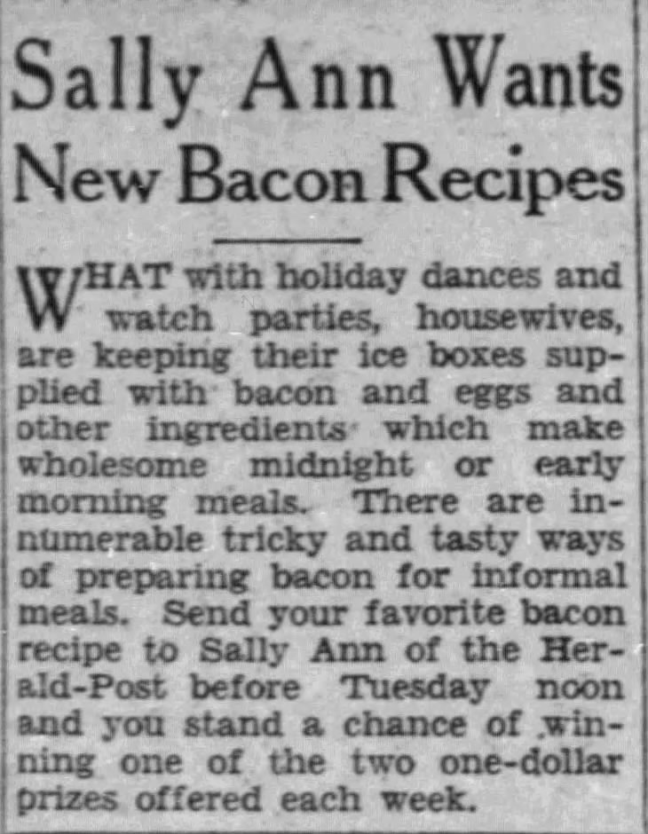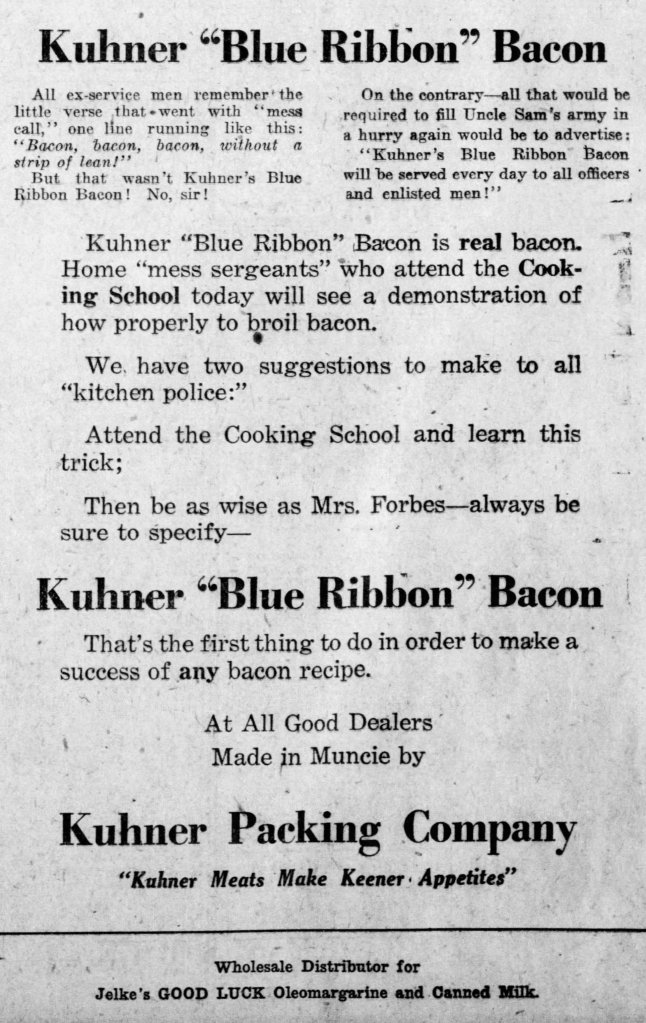 Muncie,Indiana 1925. Interesting targeted demographic. During this time period, women tended to be four or five years younger than their husbands. Was this doubly aimed at men in their mid-twenties to early thirties, who were developing a bit of nostalgia for their youth and their younger wives who wanted a solution to the request for “Bacon like we used to have in the Army”?