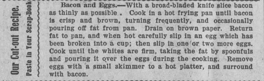 1909 recipe for cooking bacon and eggs. I can confirm, this is the correct way to do it.