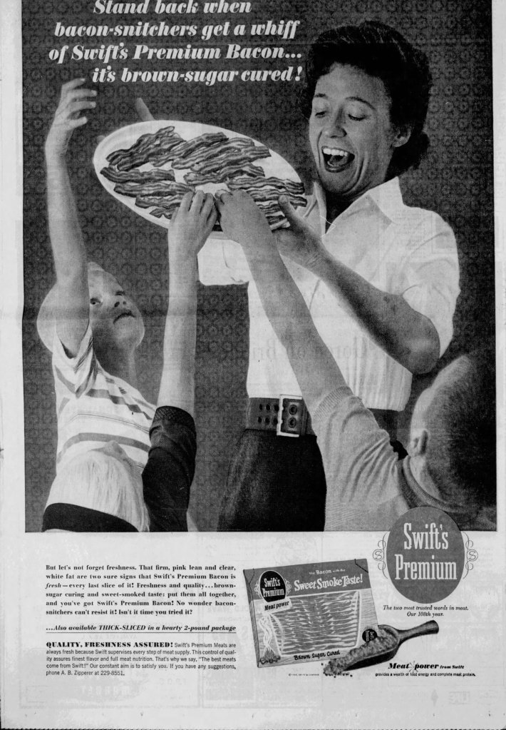 Tampa Tribune, 1963 ad for Swift products. “Bacon Snitchers” sounds like an old person trying not to swear around children.