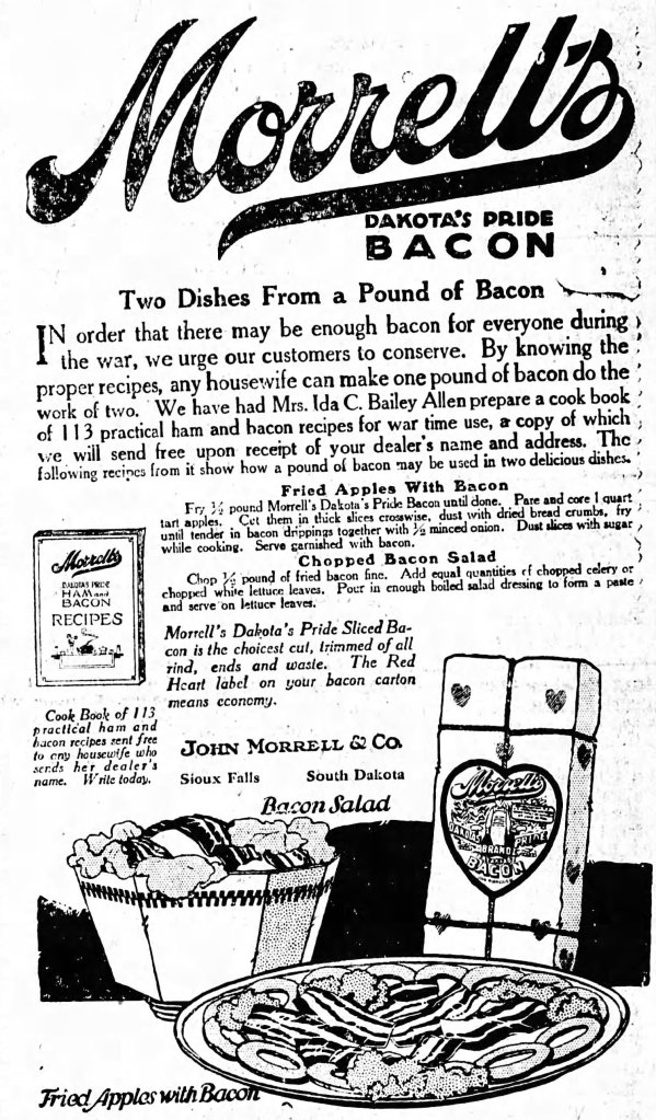 1918 Morrell and Co advertisement from Bismarck,North Dakota. While there was no official rationing during the war, people were encouraged to cut back on mutton, beef, and pork. A term we still use today, “Meatless Monday”, was coined during that time.